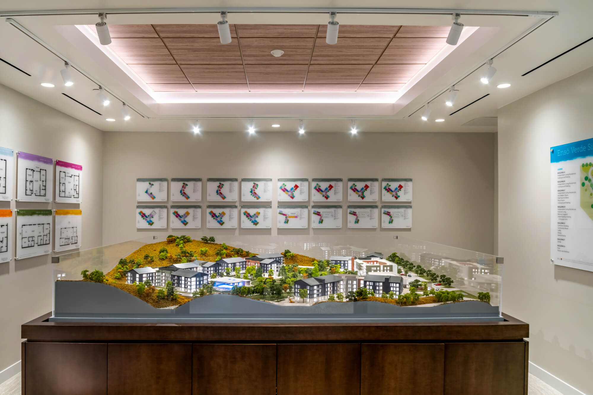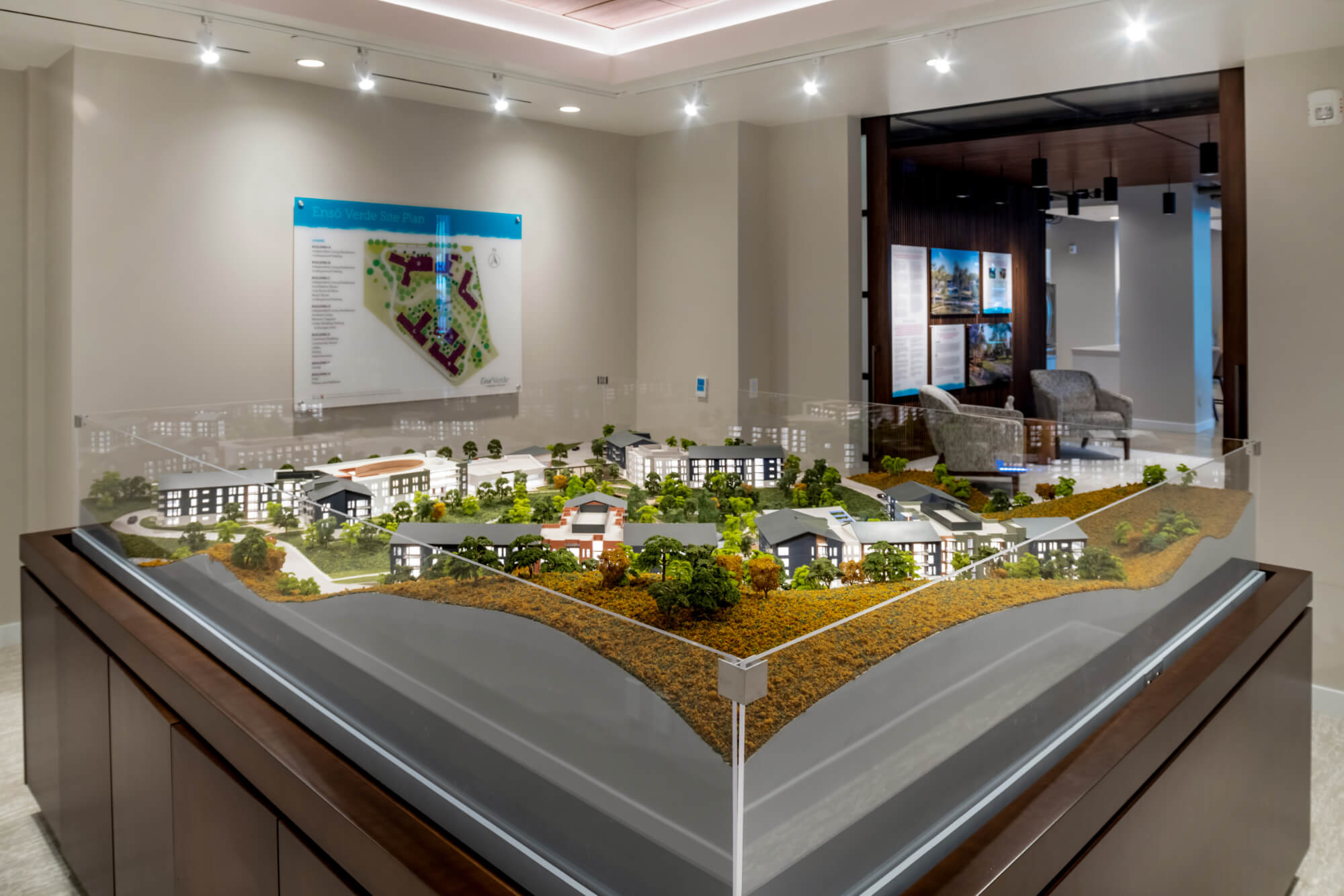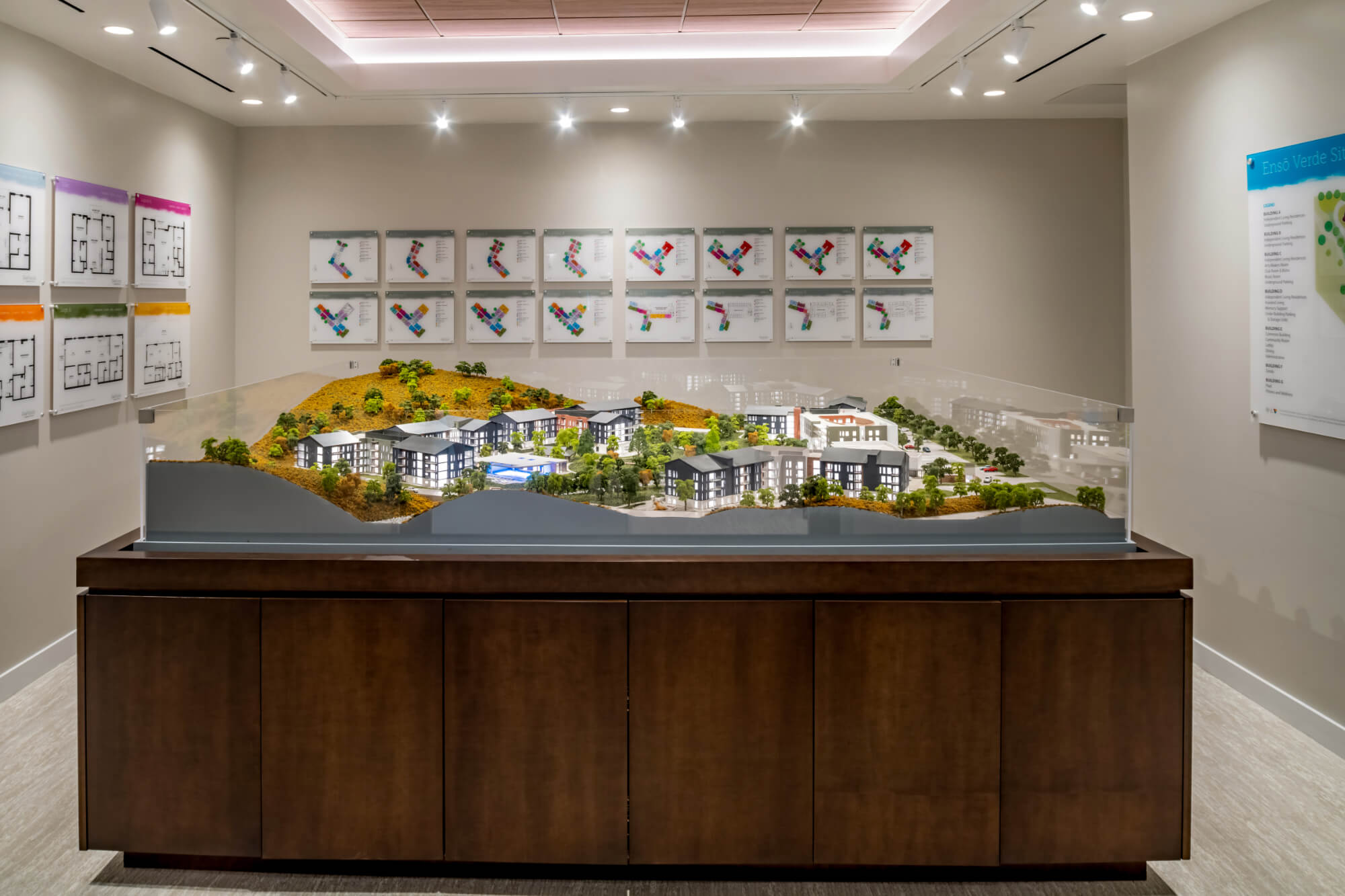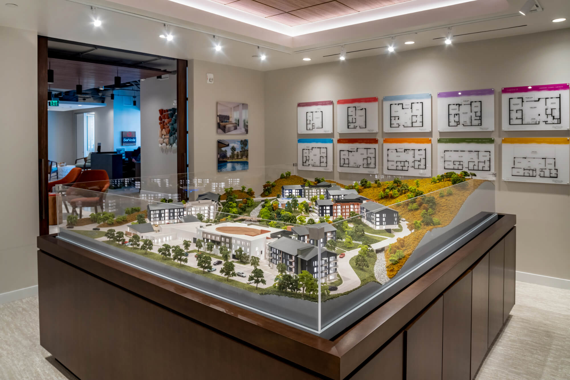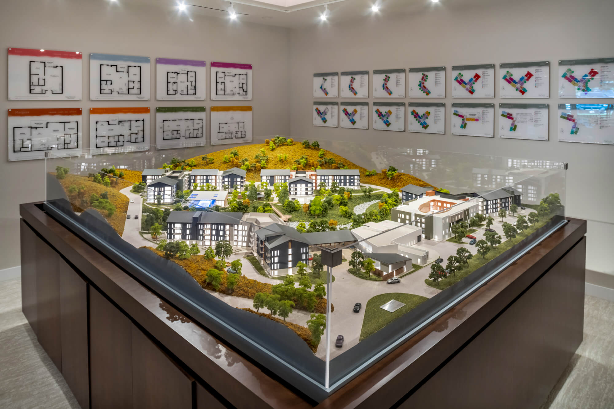 PREMIER3D were approach to produce a 1:128 (3/32) Scale Model with full interactive capabilities (IAD enabled) for the Fall Launch of the Display Centre in Simi Valley, California. As center piece of the display, the model measures 110 Inches in length, 100 inches in width and forms the central talking point of the sales center. The model allows clients to use the IPAD to see Floor Plans, 3D Renders of the apartment whilst illuminating the apartment on the model.